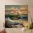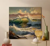 This oil painting captures the power and beauty of offshore waves. Towering swells rise and surge, rendered in bold strokes of deep blue, sea green, and foamy white, creating striking contrasts. Sunlight reflects off the ocean’s surface, shimmering and ever-shifting. The painting evokes a sense of freedom, the majesty of nature, and the boundless energy of the sea.