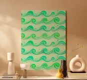 Stravagante motivo acquatico costiero con onde dell'oceano in verde, verde acqua e turchese, su uno sfondo verde menta.