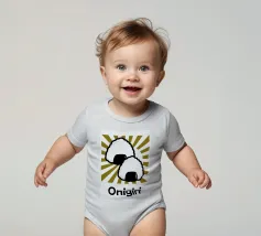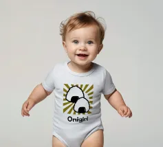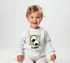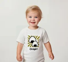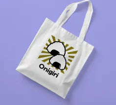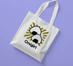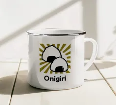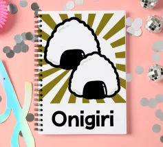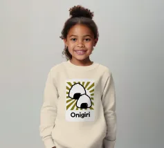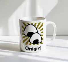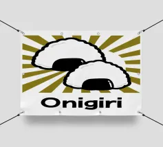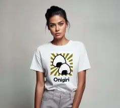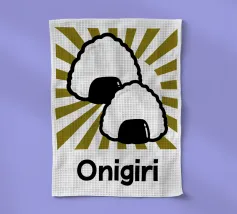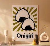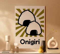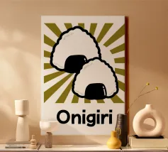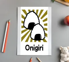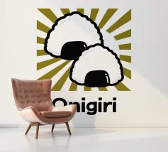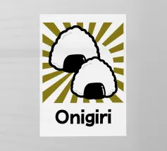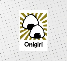 Due onigiri stilizzati, o palle di riso, sono raffigurati su uno sfondo di raggi dorati. La parola "Onigiri" è ben visibile sotto l'immagine.