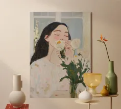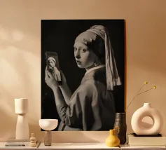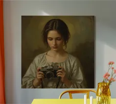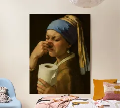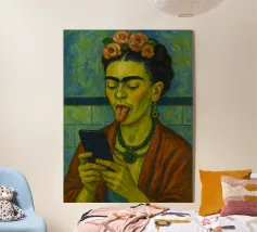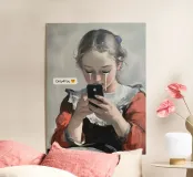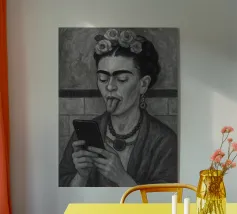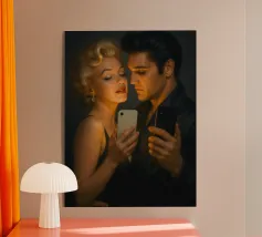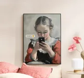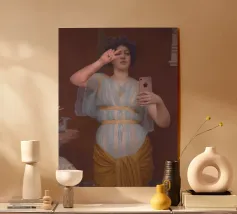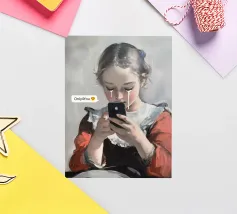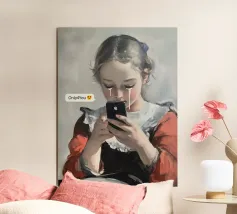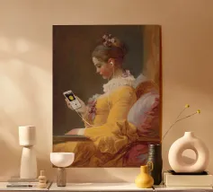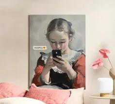 "In questa curiosa reinterpretazione di un quadro classico, una bella e giovane donna tiene in mano il suo telefono mentre un messaggio con un emoji romantico la coglie completamente di sorpresa. I suoi occhi si riempiono di lacrime, ma sono dovute all'emozione o alla pura ironia? La scena fonde il dramma delle grandi storie d'amore con le piccole tragedie delle notifiche moderne".