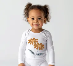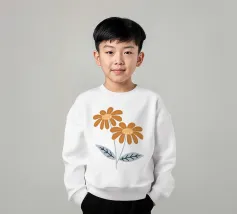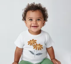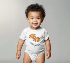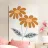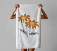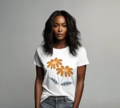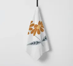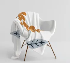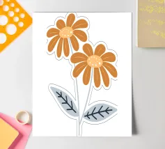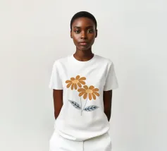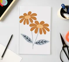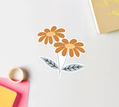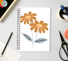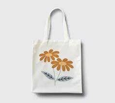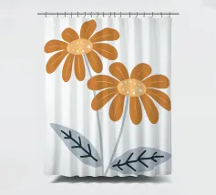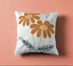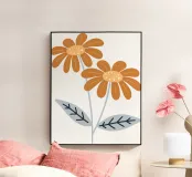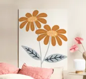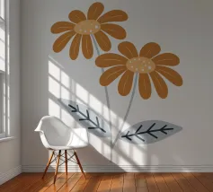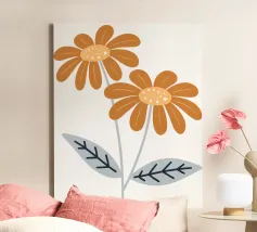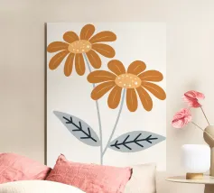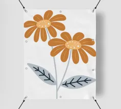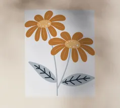 Due fiori arancioni stilizzati con centro bianco e foglie azzurre sono incastonati. La semplicità del disegno conferisce un'atmosfera moderna e minimalista.