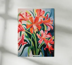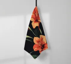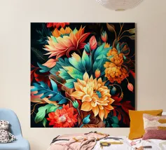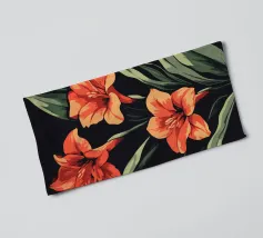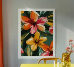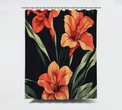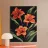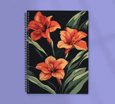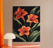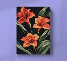 I fiori di colore arancione brillante con foglie verdi si stagliano su uno sfondo scuro, creando un vivido contrasto. La rappresentazione dettagliata dei fiori ne evidenzia la naturale bellezza ed eleganza.