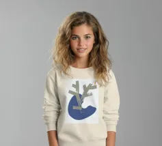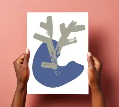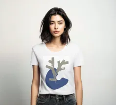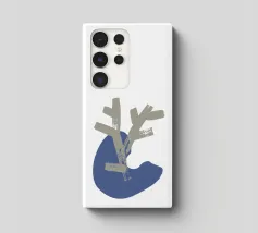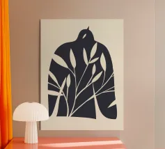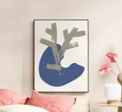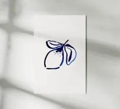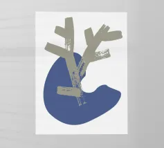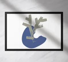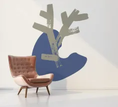 Un disegno minimalista presenta una forma astratta beige a forma di ramo sovrapposta a una forma organica blu. La composizione enfatizza la semplicità e il contrasto su uno sfondo bianco.