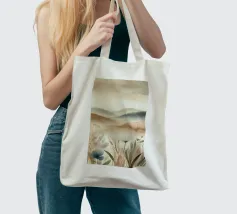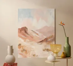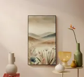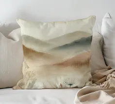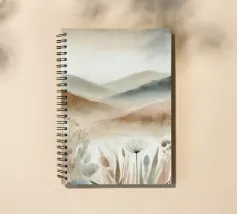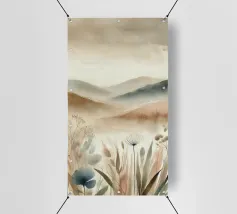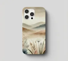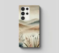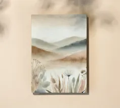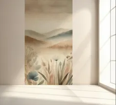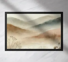 Un disegno in stile acquerello che raffigura un paesaggio tranquillo con dolci colline dai toni beige e kaki. Le forme astratte delle piante si fondono armoniosamente con lo sfondo lontano, creando una transizione fluida e rilassante. I colori tenui e le pennellate delicate evocano un'atmosfera serena e meditativa.
