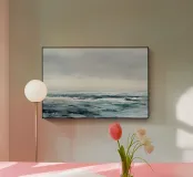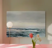 A quiet seascape rendered in soft watercolor layers of misty grey, pale blue, and muted teal. Gentle waves roll beneath a wide, clouded sky, with subtle transitions between sea and air creating a calm, meditative atmosphere. The composition is minimal and expansive, allowing texture and tone to suggest movement rather than define it. Ideal for coastal, modern, or minimalist interiors, this artwork brings stillness, balance, and a sense of open horizon into the space.
