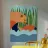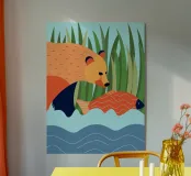 Assistete a un momento epico tra un orso e un pesce in questa splendida illustrazione naturalistica. I colori vivaci e il design minimalista creano un'atmosfera vivace e accattivante.