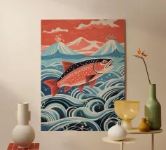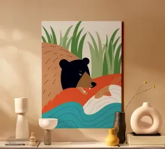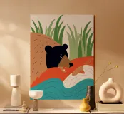 Assistete a un momento epico tra un orso e un pesce in questa splendida illustrazione naturalistica. I colori vivaci e il design minimalista creano un'atmosfera vivace e accattivante.