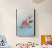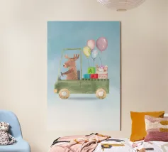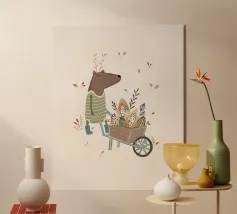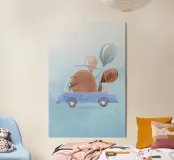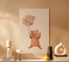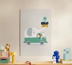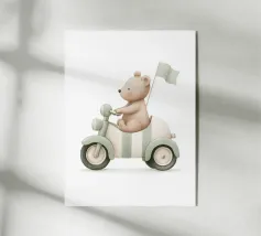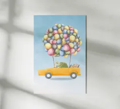 Un'illustrazione stravagante con un allegro orso che guida una macchinina blu sotto la pioggia, accompagnato da palloncini colorati. Lo stile morbido dell'acquerello e gli elementi giocosi la rendono perfetta per la stanza di un bambino o come disegno per abiti e accessori. Questa incantevole scena irradia calore e gioia nonostante il tempo piovoso, simboleggiando lo spirito di avventura. Questo delizioso disegno può essere applicato su felpe con cappuccio, magliette (per bambini e adulti), poster, quaderni, asciugamani, abbigliamento e accessori per bambini.