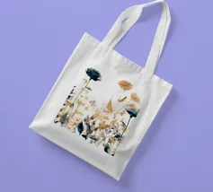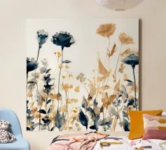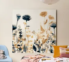 Un'espressiva combinazione di ocra ramato e blu intenso conferisce a questo studio floreale un senso di calore e contrasto. Gli alti steli si ergono in silhouette fluide, come sagome di fiori di campo contro un cielo luminoso.