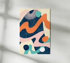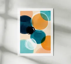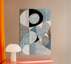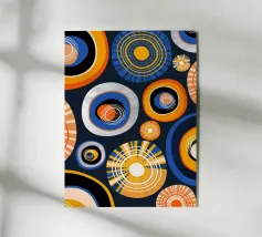 Audaci cerchi sovrapposti in blu e arancione creano un motivo dinamico su uno sfondo chiaro. I bordi ruvidi e strutturati conferiscono un senso di movimento ed energia.