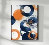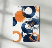 Audaci cerchi sovrapposti in blu e arancione creano un motivo dinamico su uno sfondo chiaro. I bordi ruvidi e strutturati conferiscono un senso di movimento ed energia.