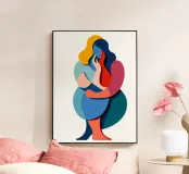 Una composizione astratta stilizzata presenta forme sovrapposte dai colori vivaci, che danno l'impressione di una persona seduta. L'uso audace di blu, rosso, arancione e verde acqua crea un senso dinamico di movimento e forma.