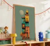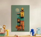 Un'opera d'arte stravagante e verticale di una stretta villetta a schiera dai colori vivaci, illuminata dolcemente dall'interno e coronata da un gufo gigante appollaiato sul tetto sotto la luna piena. I libri riempiono gli scaffali dei balconi, le zucche allineano i gradini e il caldo bagliore della sera porta mistero e fascino. Un'opera surreale e narrativa, perfetta per gli amanti della fantasia e dell'architettura.