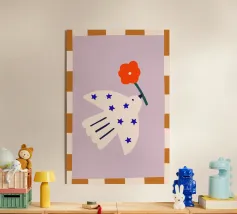 Questo poster dal design accattivante raffigura una colomba bianca con dei fiori, simbolo di pace e speranza. I colori tenui e le strisce grafiche conferiscono al motivo un aspetto tranquillo e moderno. Ideale per il soggiorno, la camera dei bambini o le zone giorno tranquille, è perfetto per chi desidera arredare la propria casa con un messaggio positivo e armonioso.