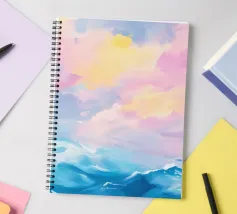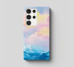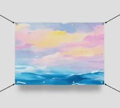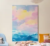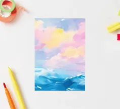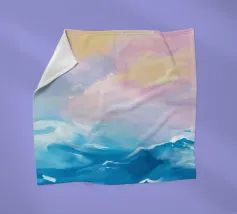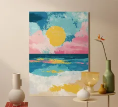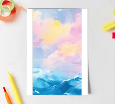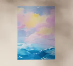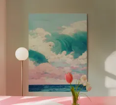 Una scena minimalista vi trasporta in un mondo di pace e armonia. Nuvole rosa e gialle fluttuano in un mare azzurro di nuvole, delicatamente illuminato da una luce soffusa. Le dolci increspature sulla superficie dell'acqua e la fresca tavolozza di colori esaltano l'atmosfera pacifica. Immergetevi in questo mondo da sogno e trovate un momento di relax.