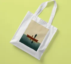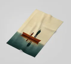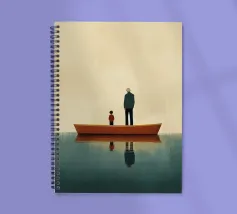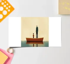 Illustrazione minimalista e piatta di un uomo anziano in piedi sul bordo di una barca con suo figlio. Entrambi guardano lontano dalla macchina fotografica, con uno sfondo semplice e colori tenui che trasmettono un'atmosfera pacifica e serena e un senso di calma nel loro comportamento. L'attenzione è rivolta a catturare espressioni sottili e dettagli che trasmettono profondità senza essere opprimenti o ingombranti. Questo stile riflette il minimalismo scandinavo, pur mantenendo l'intensità emotiva.