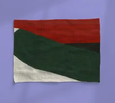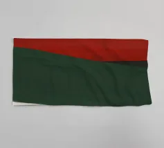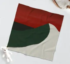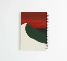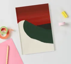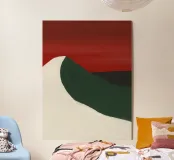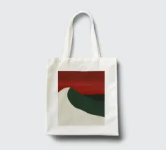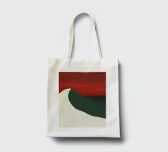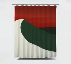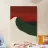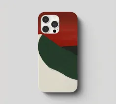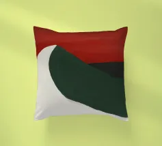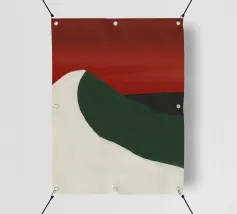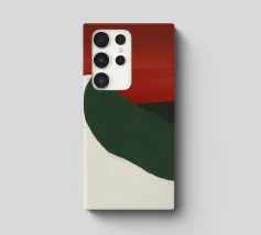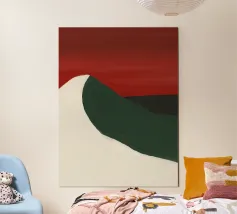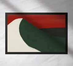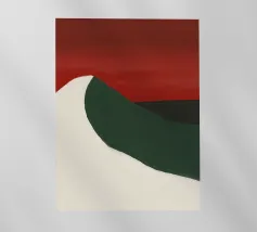 Una forma liscia e curva di colore bianco attraversa una forma verde scuro, su un drammatico sfondo rosso. La composizione evoca un senso di movimento e di contrasto grazie alle scelte cromatiche audaci.