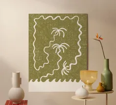 La collezione d'arte "Palm Tree Island" di Shatha Al Dafai è una collezione calma e di ispirazione tropicale. Ogni opera d'arte può essere accostata o abbinata, e alcuni pezzi sono disponibili in più opzioni di colore per adattarsi a spazi diversi.