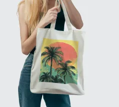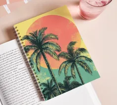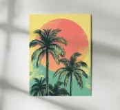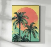 Illustration stylisée de palmiers sur fond de coucher de soleil rétro avec un grand disque rose et des teintes jaunes et vertes. Une œuvre vibrante qui évoque une ambiance tropicale et nostalgique.