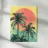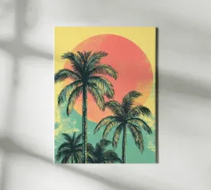 Illustrazione stilizzata di palme sullo sfondo di un tramonto retrò, con un grande disco rosa e sfumature di giallo e verde. Un'opera vibrante che evoca un'atmosfera tropicale e nostalgica.