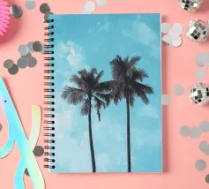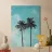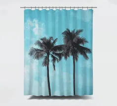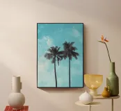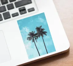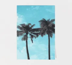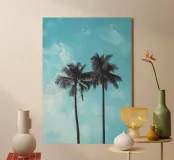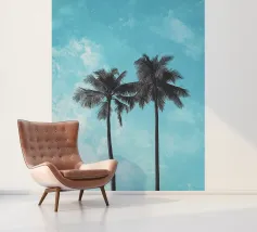 Illustrazione minimalista di due palme contro il cielo, con toni blu tenui e una texture granulosa per un'atmosfera d'altri tempi. Lo sfondo è un cielo blu chiaro con nuvole sottili.