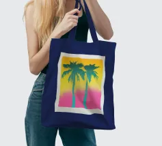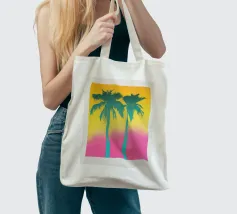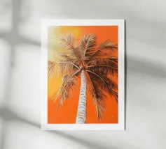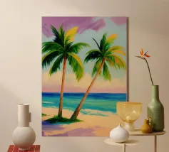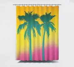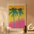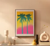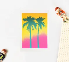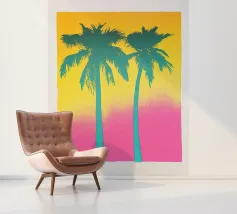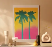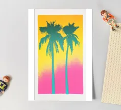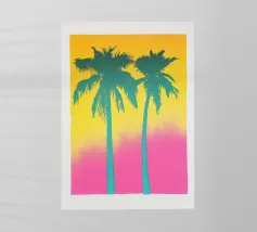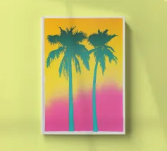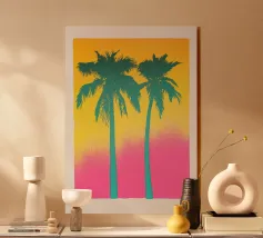 Una serigrafia di due palme, un design semplice con una sfumatura di colore rosa e giallo sullo sfondo, riflessi verde acqua e uno stile anni '80.