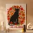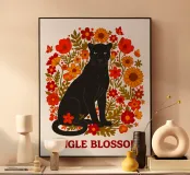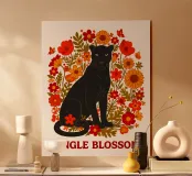 Sagoma di pantera nera circondata da fiori arancioni e rossi. Tavolozza calda, motivo floreale caratteristico; ideale per progetti audaci, tessuti grafici e accessori.
