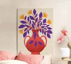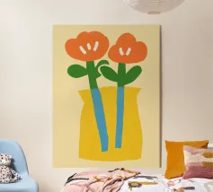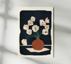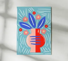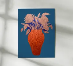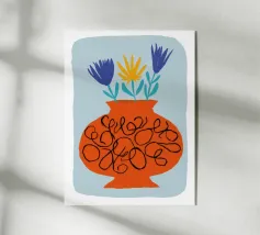 Natura morta di un bouquet di fiori blu stilizzati in un vaso arancione a forma di zucca, che crea una composizione floreale unica e popolare.