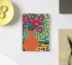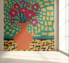 Una gioiosa natura morta di un bouquet di papaveri rossi in un vaso di terracotta, su un allegro sfondo patchwork di piastrelle gialle e blu.