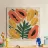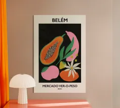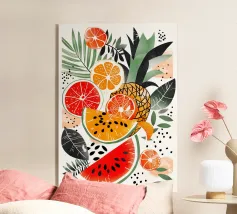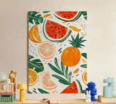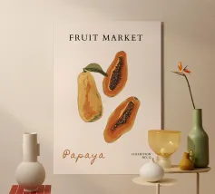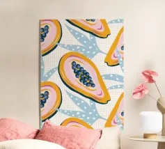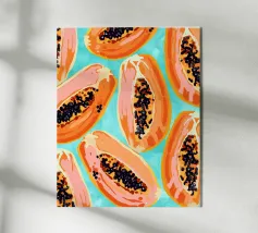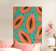 Un'illustrazione vivace e stilizzata di papaya a fette con foglie verde scuro su uno sfondo chiaro. Il motivo ripetitivo e il colore arancione brillante creano un'atmosfera fresca e tropicale.