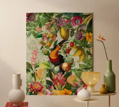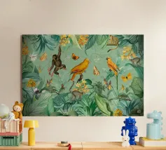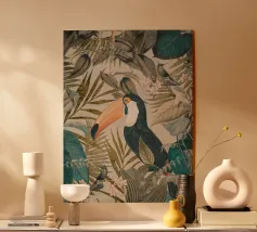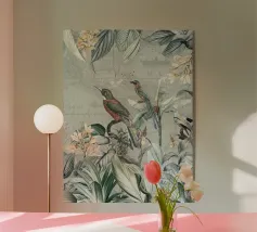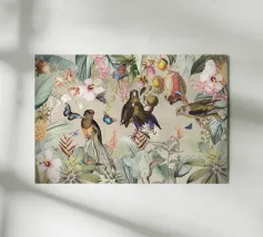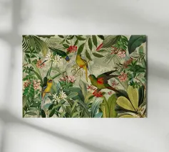 Un vivace collage di illustrazioni vintage con bellissimi e colorati pappagalli verdi appollaiati in mezzo a un lussureggiante paesaggio floreale. La scena è ricca di fascino tropicale ed esotico, poiché i pappagalli si stagliano sullo sfondo del fogliame vibrante della giungla. Intorno a loro sbocciano incredibili fiori esotici, mentre i rami di palma aggiungono un tocco di eleganza tropicale. Sullo sfondo, una mappa d'epoca emerge dolcemente, aggiungendo un senso di avventura e di viaggio. Questa miscela armoniosa di natura, fauna selvatica e fascino vintage crea un disegno senza tempo, perfetto per gli amanti dei paesaggi esotici e dell'arte nostalgica.