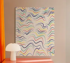 Questa opera d'arte digitale a linee parallele colorate è un pezzo di grande impatto visivo che mette in mostra l'uso di linee precise. L'artista (kathrinmay) utilizza linee di diversa lunghezza per creare un senso di dimensionalità, mentre l'uso dei colori crea equilibrio.