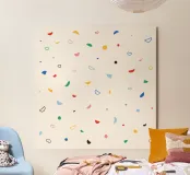 Parete di arrampicata/bouldering colorata con diverse prese per l'arrampicata. Io stessa sono un'arrampicatrice, quindi questo progetto viene dal mio cuore!