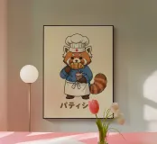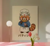 A red panda dressed as a pastry chef holds a tray of sweets, featuring Japanese text that adds a touch of authentic bakery charm.