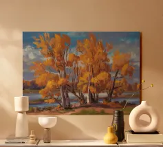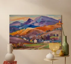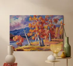 Un pittoresco paesaggio autunnale che raffigura un villaggio o una fattoria adagiata su una collina, circondata da un mosaico di alberi colorati nei toni dell'arancione e del giallo e da campi coltivati, con le lontane montagne blu a completare la scena.