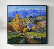 Un pittoresco paesaggio autunnale che raffigura un villaggio o una fattoria adagiata su una collina, circondata da un mosaico di alberi colorati nei toni dell'arancione e del giallo e da campi coltivati, con le lontane montagne blu a completare la scena.