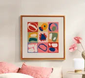 Una composizione astratta moderna e giocosa, caratterizzata da una disposizione a griglia di forme organiche e colorate. L'opera si presenta come un puzzle sofisticato ed equilibrato di forme e colori.