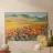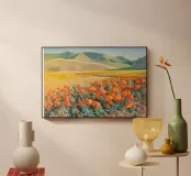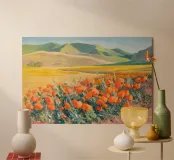 Un campo di papaveri arancioni crea un brillante patchwork di colori su dolci colline verdi e dorate, rese in modo stilizzato e moderno che enfatizza la gioia del paesaggio.