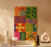 Una composizione astratta audace ed energica, caratterizzata da una griglia di motivi geometrici colorati. Il vibrante mix di forme, dai soli alle scacchiere, crea una festa visiva gioiosa e dinamica.