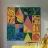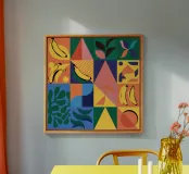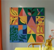 Un audace e dinamico patchwork di forme geometriche, con banane stilizzate e foglie tropicali. La palette di colori vivaci e il forte stile grafico creano una composizione giocosa ed energica.