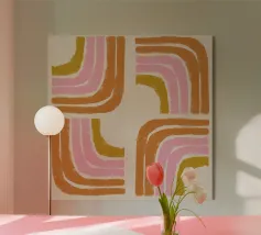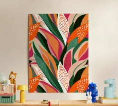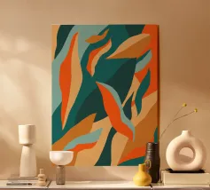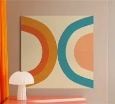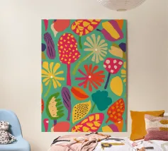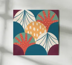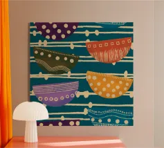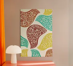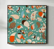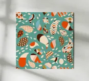 Una vibrante fusione di estetica moderna di metà secolo e boho, questo motivo ispirato al paisley presenta intricati dettagli patchwork con motivi geometrici, floreali e astratti. I toni terrosi dell'arancione, del marrone e del crema si stagliano su uno sfondo verde acqua, creando un'atmosfera nostalgica ma fresca. Perfetto per arredare la casa in stile retrò, per creare una parete elegante o per creare tessuti di grande effetto.