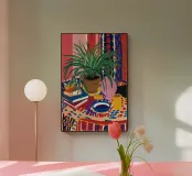 A still life of a potted plant and other objects on a table with a colorful, patterned rug underneath. The composition against a pink wall is modern, eclectic, and full of charming, decorative detail.