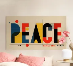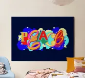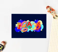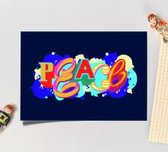 Scrittura di pace. Composizione dinamica, con colori pop e bolle sullo sfondo.