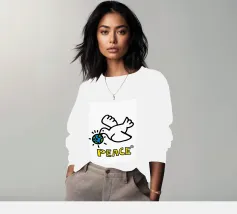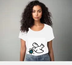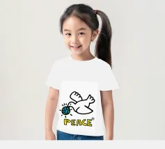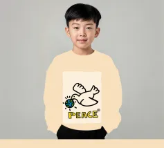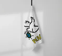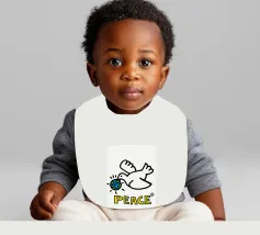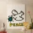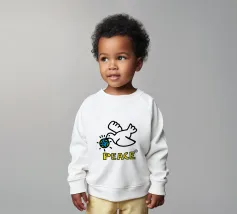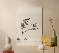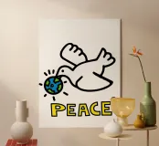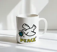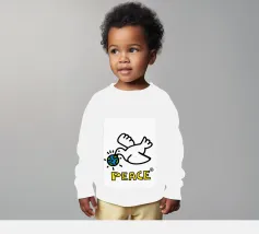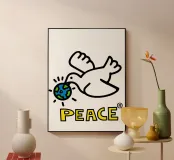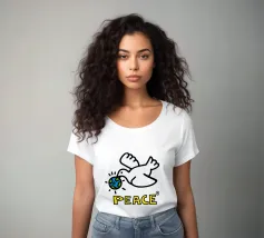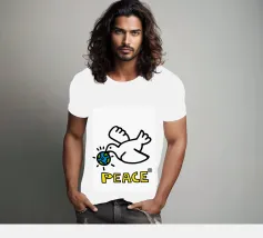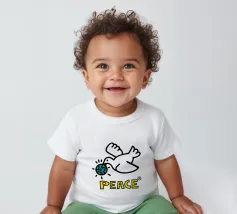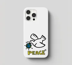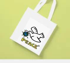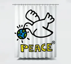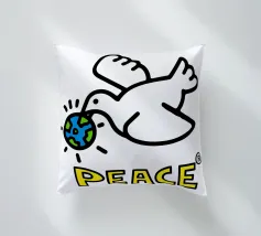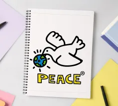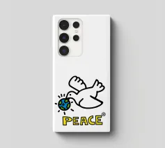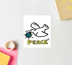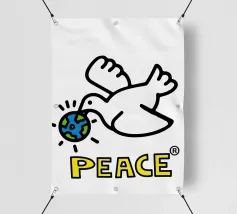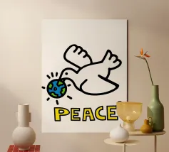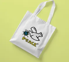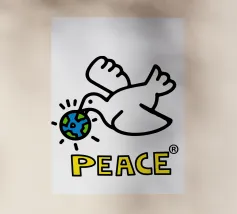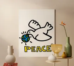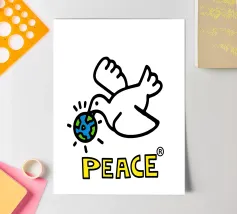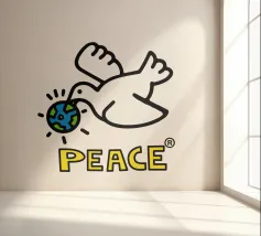 Una colomba delineata in nero tiene nel becco una piccola Terra stilizzata, simbolo di pace globale. La parola "PACE" è scritta in grassetto a caratteri gialli sotto la colomba.