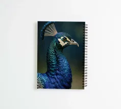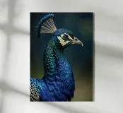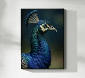 Un ritratto elegante e mozzafiato di un pavone, che mostra i dettagli intricati delle sue magnifiche piume blu e verdi. I ricchi colori gioiello e lo sguardo maestoso dell'uccello creano un senso di lusso e grazia.