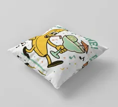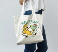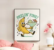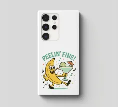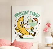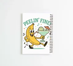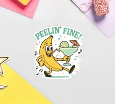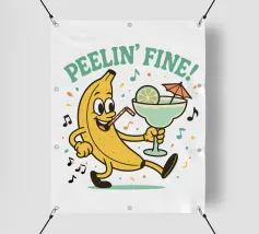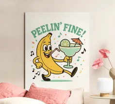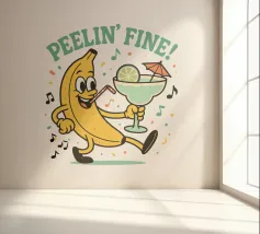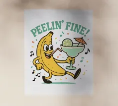 Un'allegra banana dei cartoni animati, con un grande sorriso, tiene in mano una bevanda tropicale, completa di una fetta di lime e di un piccolo ombrello. Note musicali fluttuano intorno, suggerendo un'atmosfera vivace e divertente. Il testo "Peelin' Fine!" aggiunge un tocco giocoso e scherzoso.
