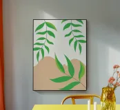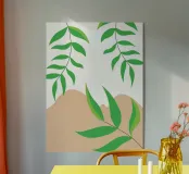Foglie verdi e rigogliose penzolano con grazia da rami sottili. Il design è caratterizzato da un'estetica minimalista con vivaci elementi naturali.