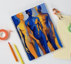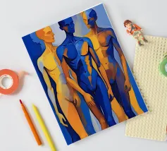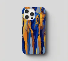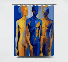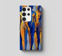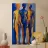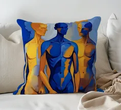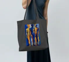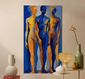 Questo dipinto figurativo, in formato ritratto, mostra un gruppo di tre esili figure maschili in piedi, disposte in una posa statica. Lo stile è espressivo e astratto, con i corpi divisi in campi di colore contrastanti. La tavolozza è limitata al blu intenso e al giallo oro/ocra brillante. La figura centrale domina in blu, mentre le figure esterne sono divise in giallo-blu. La sovrapposizione e la dura transizione dei colori sui corpi creano un effetto dinamico, quasi spettrale.
