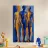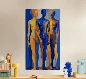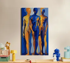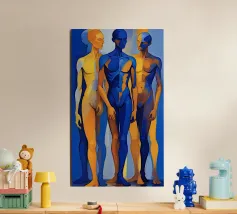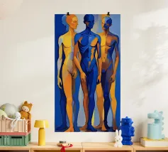 Dieses hochformatige, figurative Gemälde zeigt eine Gruppe von drei schlanken, stehenden männlichen Figuren, die in einer statischen Pose angeordnet sind. Der Stil ist expressiv und abstrahiert, wobei die Körper in kontrastreiche Farbfelder unterteilt sind. Die Palette ist auf tiefes Blau und leuchtendes Goldgelb/Ocker beschränkt. Die mittlere Figur dominiert in Blau, während die äußeren Figuren gelb-blau gespalten sind. Die Überlagerung und der harte Farbübergang auf den Körpern erzeugen eine dynamische, fast gespenstische Wirkung.
