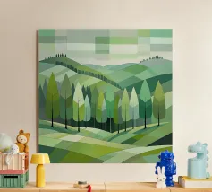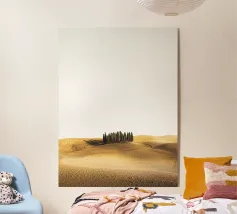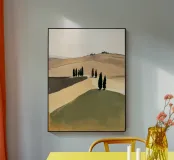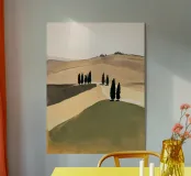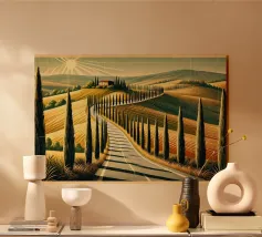 Un sereno scorcio di colline e strade tortuose, questo dipinto minimalista a guazzo cattura la calma senza tempo della campagna toscana. Con le morbide tonalità della terra e le sagome semplificate dei cipressi, distilla il paesaggio in forme pure e ritmo tranquillo.